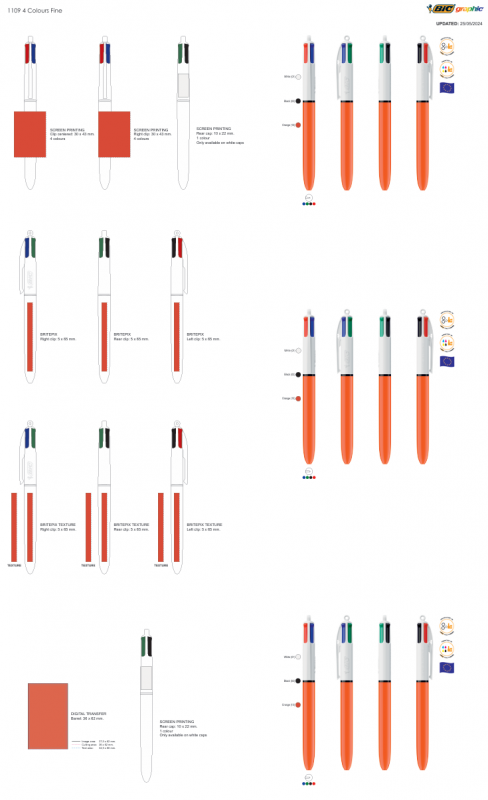 Farbenfrohe Version mit feiner Strichstärke. In vier Standard-Tintenfarben erhältlich: Blau, Schwarz, Rot und Grün. Vollfarbdruck in höchster Qualität – mit BritePix Digital. Unser legendärer BIC® 4 Colors® wird nachhaltiger, jetzt mit 13 % weniger Kunststoff im oberen Bereich!