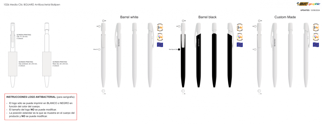 Der herausragende Werbekugelschreiber, unsere Nummer Eins: BIC Media Clic BGUARD, jetzt erhältlich mit antibakteriellem Schutz. Der antibakterielle Schutz eliminiert 99,9% aller Bakterien auf dem Schaft, dem am meisten exponierten Teil des Schreibgerätes. Weiters wird das Wachstum von Bakterien auf allen anderen sichtbaren Teilen gestoppt. Vollständiger Schutz für die gesamte Lebensdauer des Schreibgerätes, getestet gemäss dem ANTIBACTERIAL PROTOCOL ISO 22196.